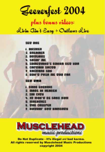 On August 20, 2004, Spider Kelly performed live, as a six-piece band, for the first time in over 20 years. Now, you too can see the fun, frolic and fiasco that resulted as they took the stage at Musclehead Music Productions' Live Room and tackled 15 of their greatest songs - all after only one rehearsal. The Geezerfest theme is rampant, and the band's self-deprecating humor is evident throughout, as is the crew's good-natured ribbing of the band during the 'less stellar' moments, which is audibly picked up by the studiocam. Also included - as a bonus on this instant-classic DVD - are two S.K. music videos: 'Livin' Ain't Easy' (featuring old photos of the band) and 'Outlaws Live', a fast moving composite of still photos taken of the band and other attendees at the event. A must-have for any Spider Kelly fan who didn't make it to Geezerfest '04, but especially required if you were there. A great way to re-live the fun, frolic and great times that were had at Geezerfest.